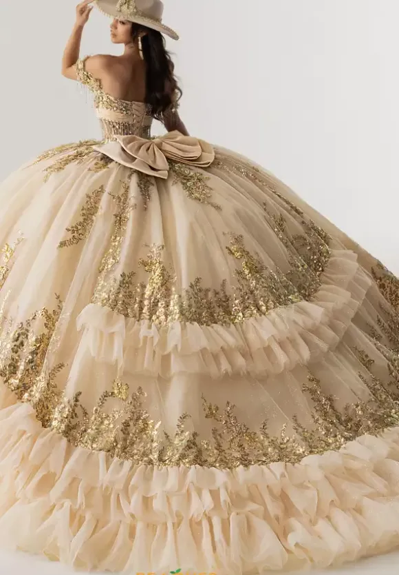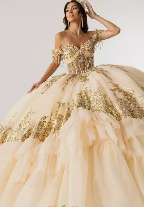 Gleam effortlessly in show stopping ball gown style RQ6012 by Rachel Allan Quince. The off the shoulder cap sleeves are delicately decorated to match the detailing along the trim of the neckline which cascades in a line of beaded fringe to dangle beautifully. Showcasing the full glittered tulle skirt displaying the ruffled tiered bottom with trailing glittered sequin to highlight the gown gracefully all night.