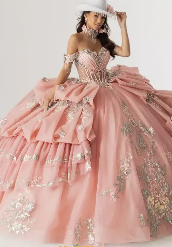 Make a statement this season in ball gown style RQ6014 by Rachel Allan Quince. The off the shoulder sweetheart neckline is paired with the lovely illusion bodice embellished with lace sequin applique and a delicate line of beaded fringe. Showcasing the multi tiered glittered tulle skirt embellished with applique meticulously along the trim of each layer and finishes with a delicate scalloped train.