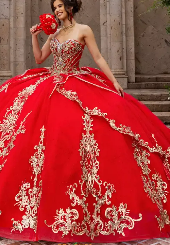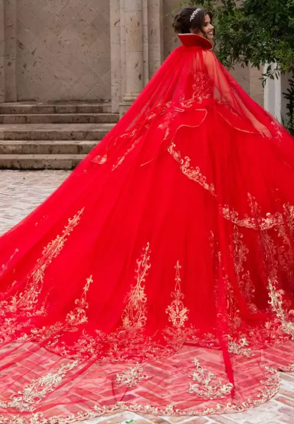 This special Rachel Allan Quince gown style RQ6015 is the perfect selection for your upcoming Quinceañera! Featuring an upward lengthy glittering tulle detachable cape, this strapless adjustable corset style is adorned in matching embroidery and stone beaded appliques the shimmer endlessly against the classic glittering tulle fabric.