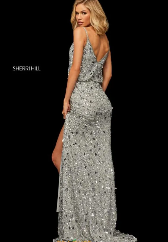 Wow the crowd at your senior prom in this dazzling Sherri Hill prom dress 52452 with a unique blouson bodice adorned completely with sparkling sequins. This shimmering gown features a loose, sleeveless bodice with V neckline, thin beaded straps and V back. The long, slim skirt has a sexy front slit and small back train. See more amazing Sherri Hill styles at Peaches Boutique.