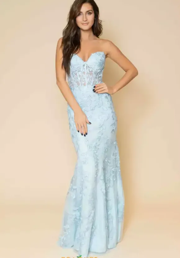 Classic Sherri Hill long dress 54227 is embellished with beautiful embroidered lace appliques and beading and is the picture perfect choice for senior prom. This exquisite gown showcases a strapless corset bodice with a sweetheart neckline, exposed boning and lace up tie low back. The long slim fitting skirt has a back sweep train. See the entire new Sherri Hill collection at Peaches Boutique.