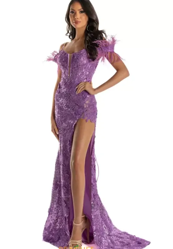 Captivate the crowd when you arrive wearing this stunning Sherri Hill style 54839. This daring dress showcases an off the shoulder neckline adorned in hand sown beadwork and soft feathers. The corset style bodice has a sweetheart neckline and a lace up open back. Delicate lace appliques are embellished throughout the look and flow into the ravishing sweep train. The wide slit also features a lace insert.