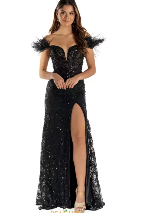 Rock this fun and flirty long dress by Sherri Hill style 55201 at your next event. This sexy look showcases a flattering v cut neckline and off the shoulder cap sleeves that are covered in feathers for added dramatics. The corset top features stunning sequins and appliques. The fitted bottom features a high slit and the same beadwork as the top. The back features a full zip up closure and long train.