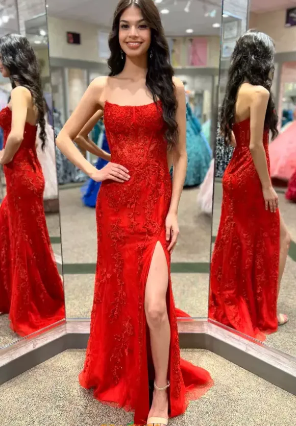 Never go out of style when you wear timeless Sherri Hill dress 55832. Adorned in stunning lace and applique details, this dress will have you looking amazing from every angle as the fitted silhouette hugs and accentuates your natural curves. The strapless corset bodice along with the classic thigh high slit and sweep train make this dress a must have.