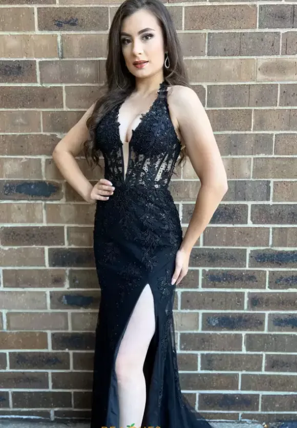 Look red carpet ready in this flattering Sherri Hill prom dress 56077. This fitted lace dress is available in an array of colors and features a plunging halter neckline on a fitted corset bodice while the floral lace and appliques make a stunning transition onto the skirt that is completed with a timeless slit and sweep train.