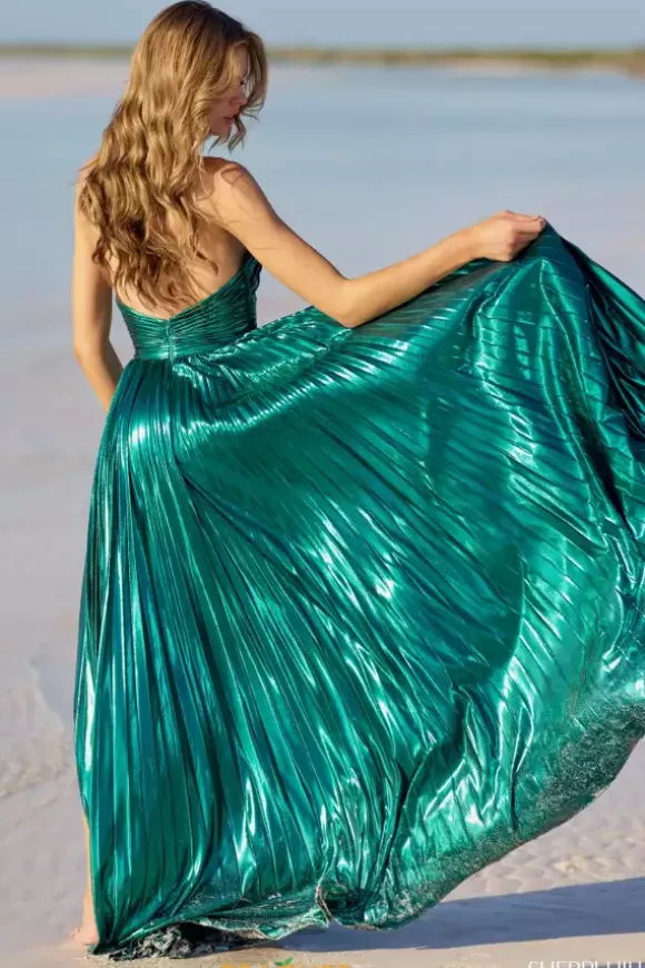 Showcase your flair at your next special occasion in Sherri Hill long fitted style 56089. The lamé material is a refreshing display of glamor, the metallic hue shimmering from all angles. Ruching throughout further adds dimension. The halter neckline and cut out bodice creates a dramatic, daring look complete with an open back style.