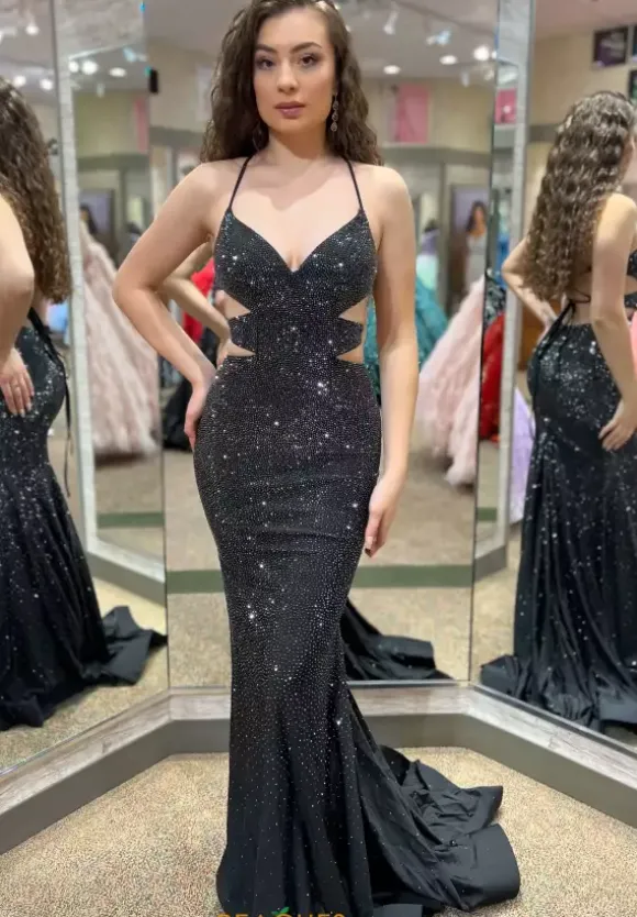 Glisten and glow all night long in this scintillating Sherri Hill long dress style 56156 drenched in sparkling heat set stones. Made in lots of colors of beaded jersey fabric, this stellar silhouette showcases a fitted bodice with a V neckline, spaghetti straps, midriff side cut outs and low back with lace up tie. The form fitting long skirt hugs your curves beautifully and has a sweep train.