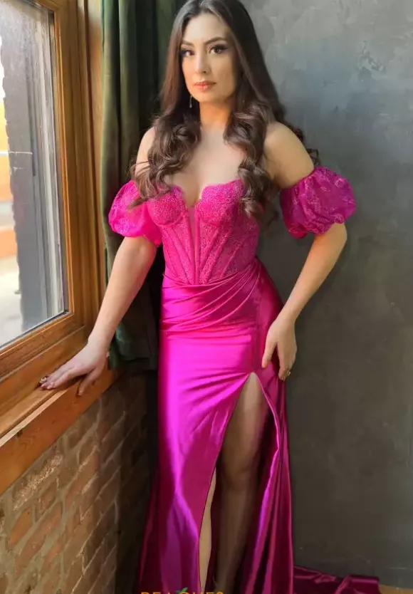 Fun and flirty Sherri Hill style 56166 features a vibrant lacey bodice with chic corset boning, glistening beading details, and a classy deep V plunge with a mesh covering. Featuring a strapless sweetheart neckline elevated with super cute puffy cap sleeves. A stunning stretch satin skirt flows elegantly, complete with a side slit and train.