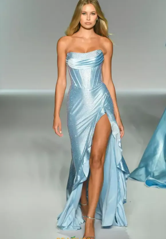 Make a memorable entrance at prom wearing this striking Sherri Hill long dress style 56992 embellished completely with hot fix stones on the jersey fabric. This extravagant silhouette features a strapless cats eye corset bodice with pleated scoop detailing, visible boning and lace up tie back. The long fitted skirt has a high front slit with ruffle trim and back sweep train.