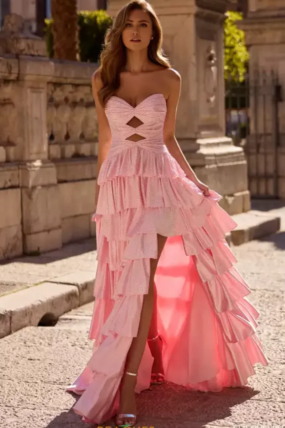 Channel your inner princess and show up to prom in this all over hot stone Sherri Hill a line dress style 57416. This gorgeous strapless sweetheart neckline dress has a lace up corset bodice with two key hole openings in the front. The tiered layered jersey skirt flows from your dropped waistline.