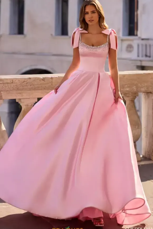 Leave everyone speechless when you wear this captivating long dress by Sherri Hill, style 57574. This mesmerizing dress features a bedazzled scoop neckline and beaded straps paired with gorgeous satin bow on each strap. This A line dress is entirely made from the most elegant satin material giving you a timeless look.