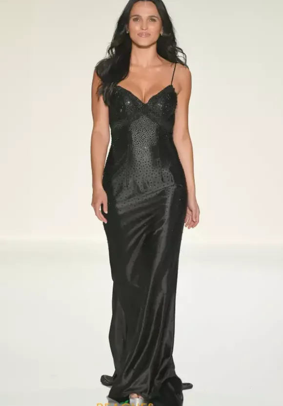 Show off your curves with this ultra flattering stretch satin Sherri Hill dress style 57821. Elegant lace traces the v neckline, cups, and open back of the fitted bodice. Color matching rhinestones adorn the stretch satin fabric making sure you gleam from any angle. The dress is completed with a popular sweep train.
