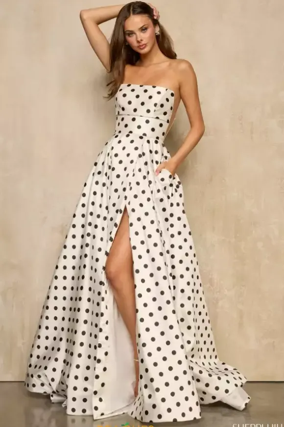 Make a fashion statement wearing Sherri Hill long dress 57871. This show stopping a line dress showcases a straight across strapless neckline and fitted bodice showing off your fitted waist. The all over polka dot design will be sure to leave a lasting impressi9on and have everyone wondering where you got your dress.