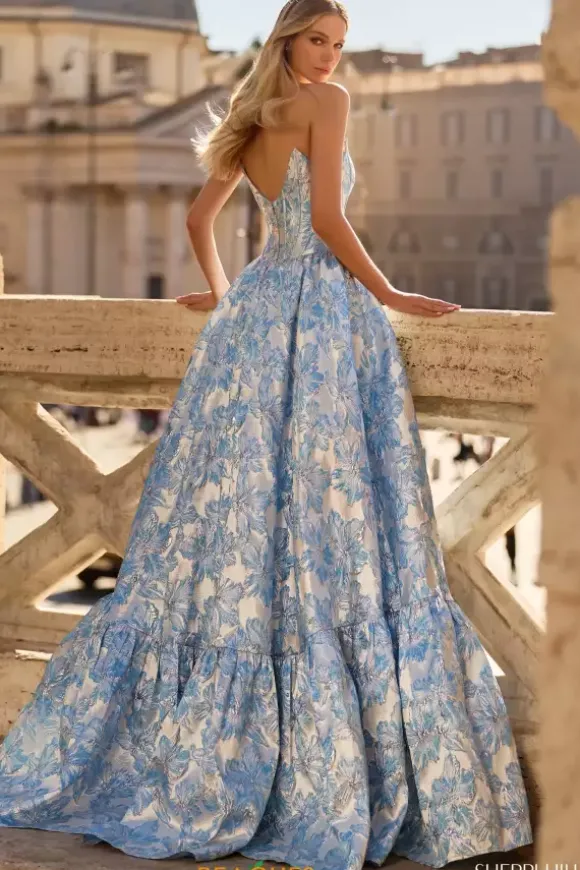 Get two gorgeous looks in one with this off the shoulder Sherri Hill a-line prom dress style 57918. The scoop neckline of the corset bodice features detachable draped sleeves that ideally match the metallic printed pattern of the closed a-line skirt. A romantic sweep train and classic zipper closure are featured.