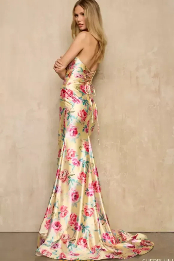 Shine like the sun in this yellow multi colored Sherri Hill prom dress style 57930. Pink flowers and green leaves adorn the glossy yellow base of this stretch satin sweep length dress for detail that will not go unnoticed. The center of the bodice features a keyhole cutout beneath the halter neckline.