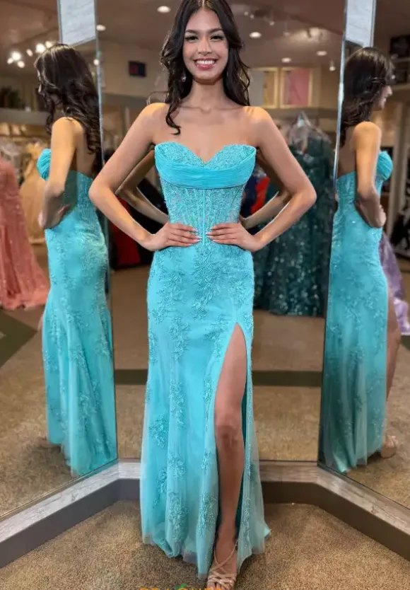 Be the envy of all when you wear this shimmering Sherri Hill prom dress style 57035. This haute dress displays ravishing sequin appliques that fully encrust the strapless sweetheart neckline and fitted corset bodice to shimmer endlessly down to the sweep train. Elegant ruching is featured beneath the neckline.