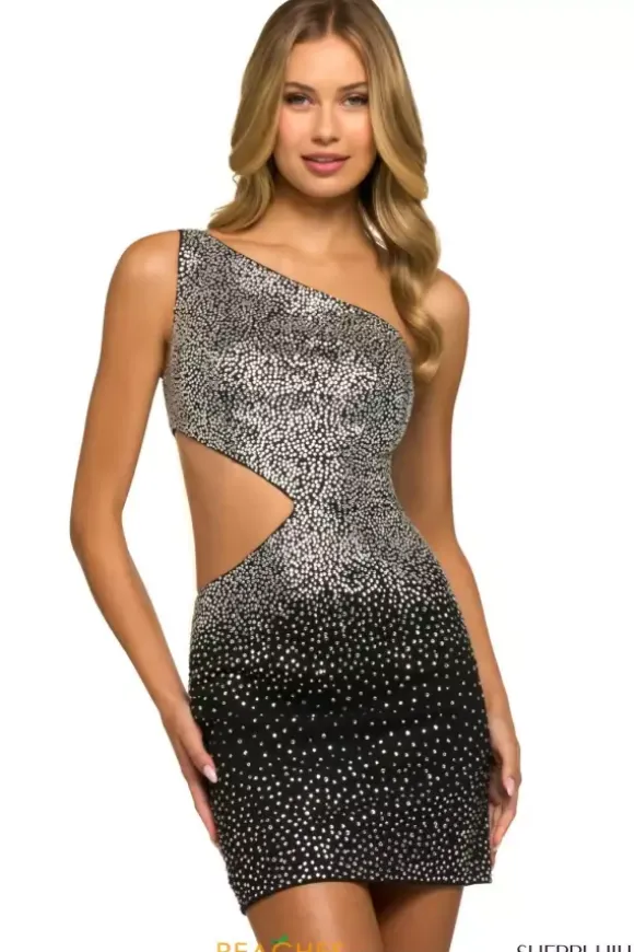 Be the life of the party in one of a kind short dress 55319 by Sherri Hill. This captivating dress showcases classic details such as an asymmetrical neckline and a side midriff cutout that adds drama to this dress. The top of this dress flaunts a fitted bodice covered in multiple dazzling stones that flare out towards the bottom.