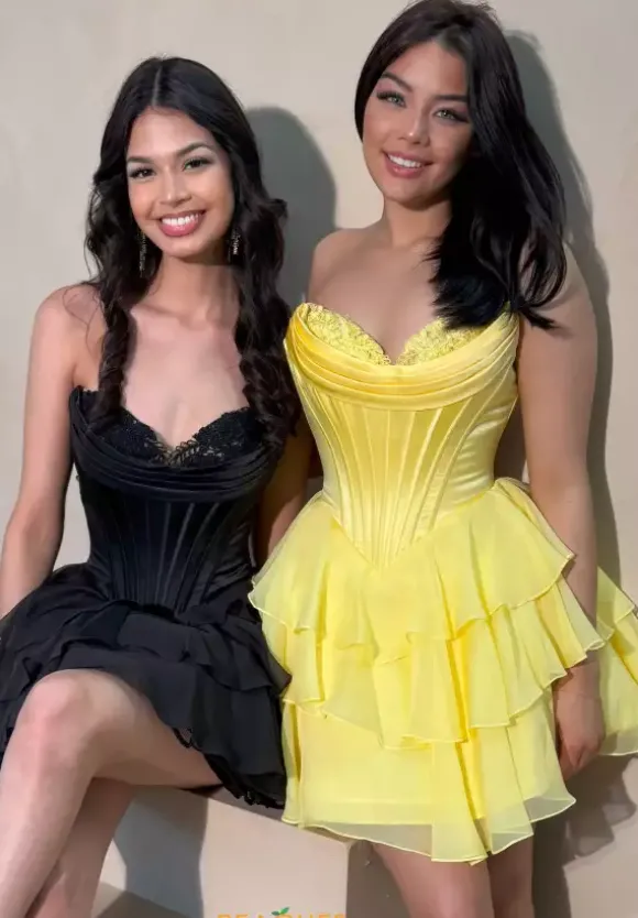 Stay on trend for homecoming this year wearing this spectacular Sherri Hill short dress style 57297 offered in a beautiful array of colors. This stellar silhouette has a satin, strapless corset bodice with a lace trimmed sweetheart neckline with pleating, visible boning and zipper back closure. The short, a line skirt is made in chiffon, ruffled layers.