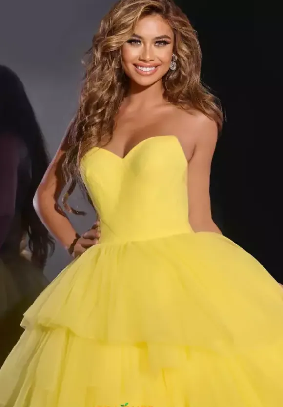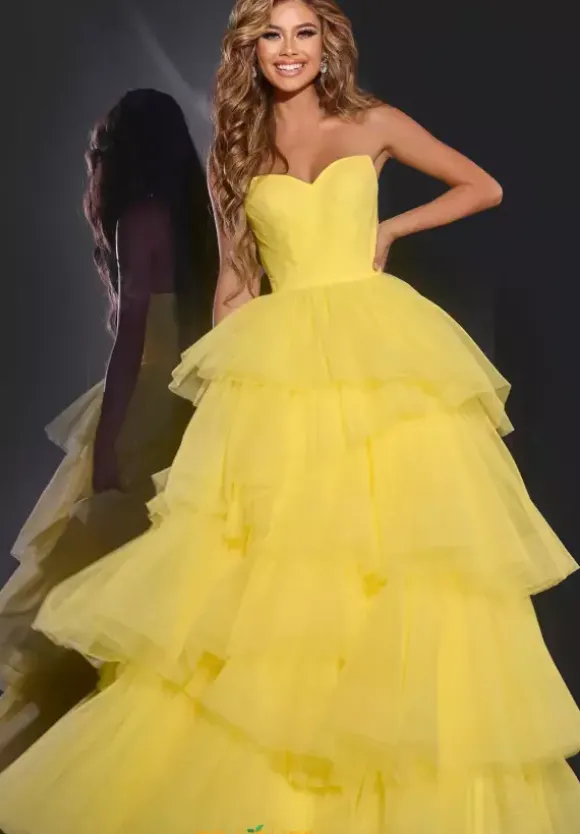 Step out of your comfort zone when you wear this flattering long ball gown dress by Jovani style 40394. The number has a lovely strapless sweetheart neckline. The material is made out of delightful tulle that features multi layer ruffles throughout the gorgeous dress and along with a back zipper for support.