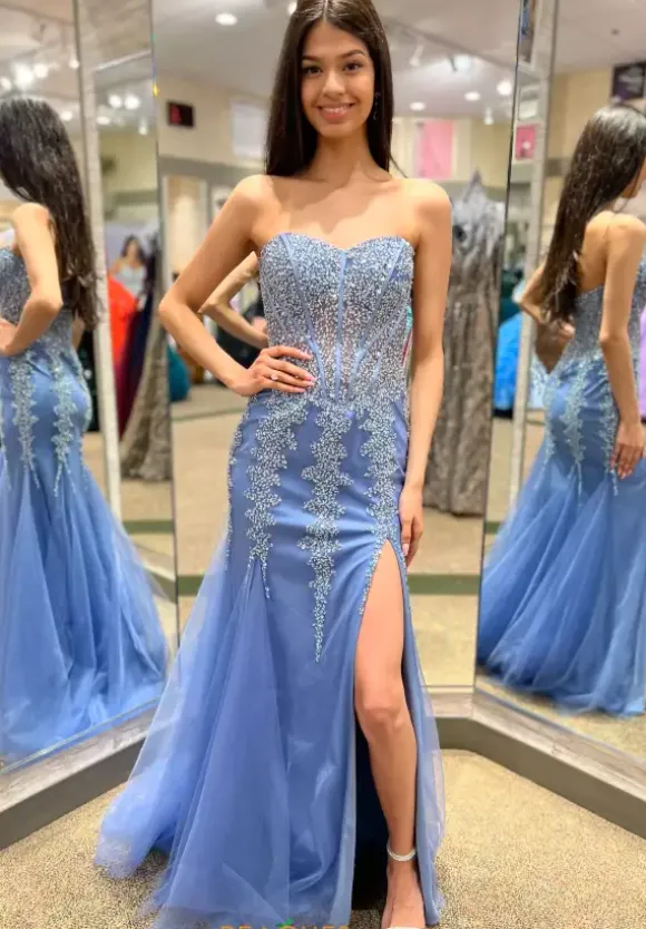 Look absolutely otherworldly in this long dress 22538 by Jovani. This fashion forward dress is perfect with a fitted corset bodice that is entirely adorned in a glistening combination of beads that make a vertical patterned transition onto the flared out tulle skirt. The tulle skirt is completed with a cascading sweep train.