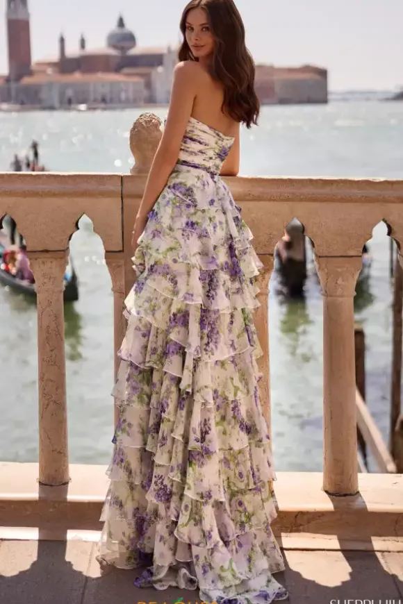 Float away on to the dance floor at your prom in this all over chiffon Sherri Hill dress 57613. This printed one of a kind a line dress has a strapless sweetheart neckline bodice that is ruched and a tied bow detail in front. The flowing layers of chiffon overlap each other giving it the right amount of fullness.