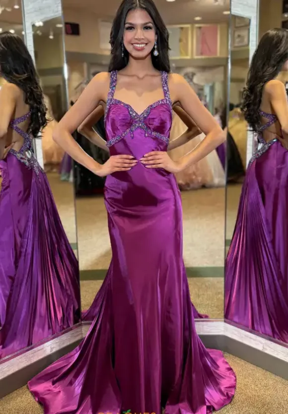 Charmeuse. Stunning Jasz Prom Dress. This Evening Dress features a sweetheart neckline, hand beaded neckline and straps, fitted silhouette, and gorgeous back with beaded criss cross straps. An elegant pleated overlay completes this look. Complement this Jasz Prom Dress with Fabulous heels and a pair of Stunning Long Earrings. Perfect for a Prom Dress, Homecoming Dress, or Pageant Dress. Jasz Prom Dresses.