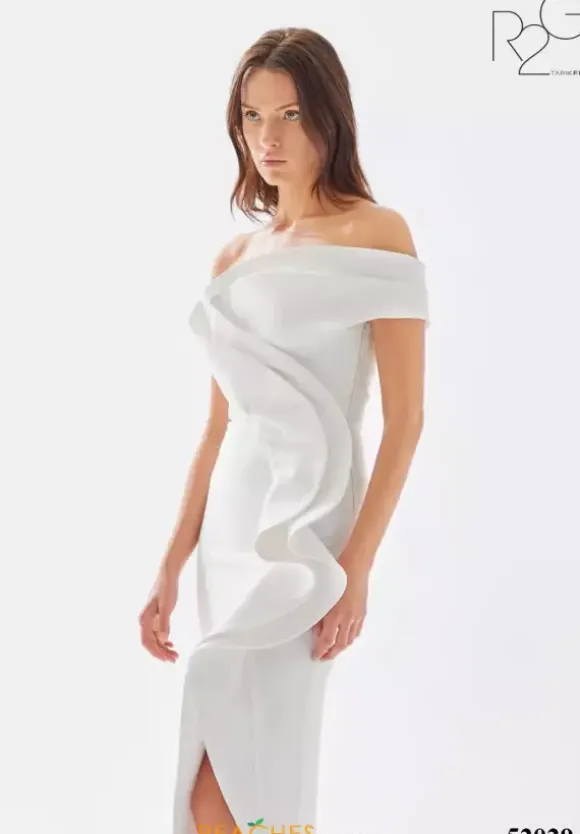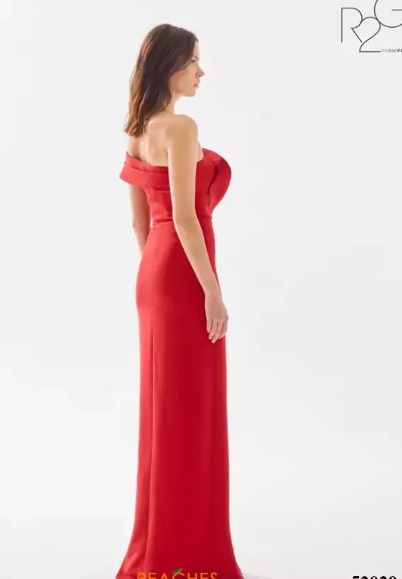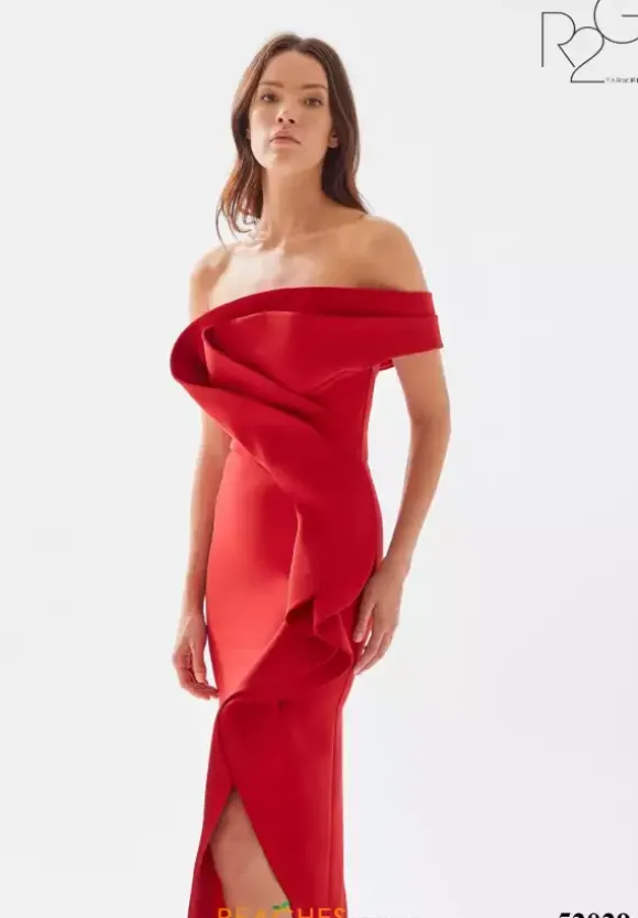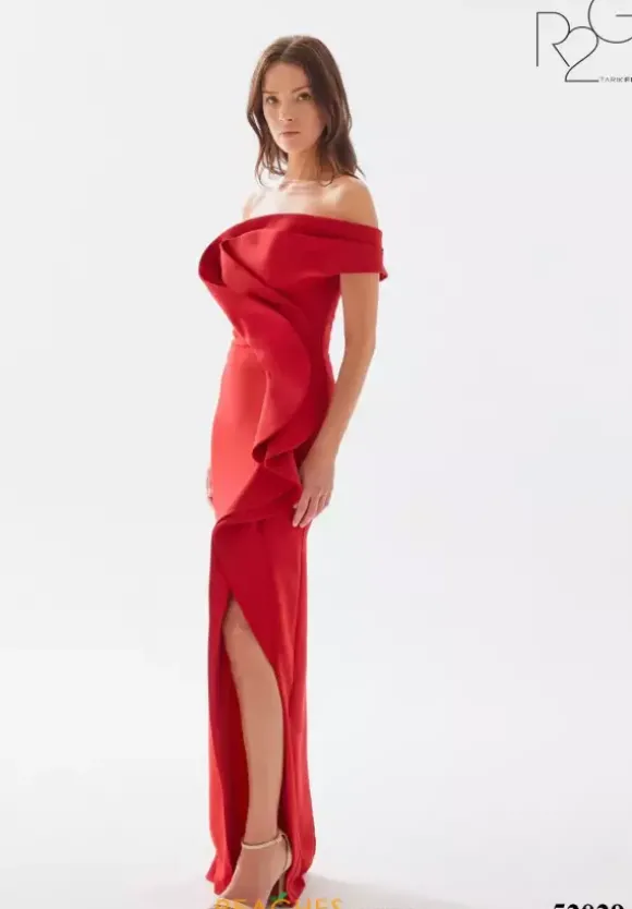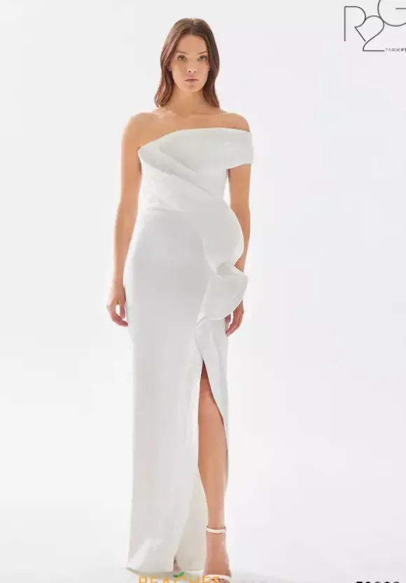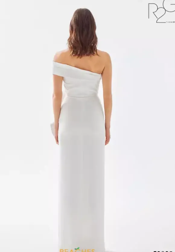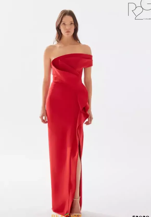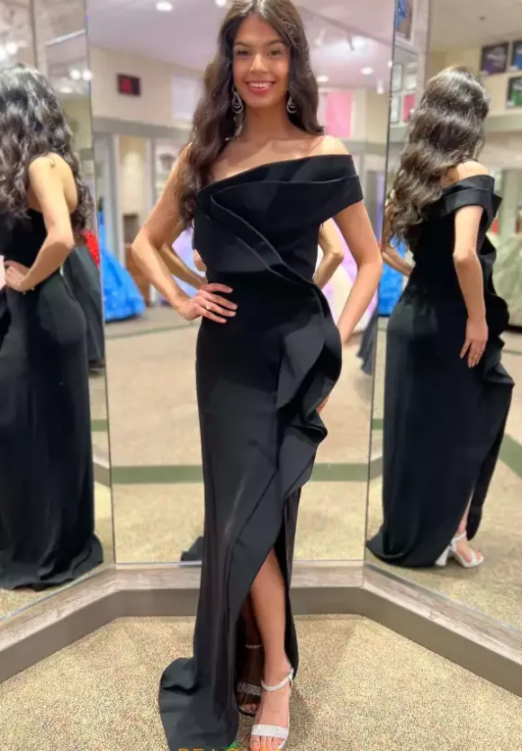 Step out of your comfort zone and wear this fashion froward long dress by Tarik Ediz, style 52029. This gorgeous number showcases a fitted silhouette with an asymmetrical of the shoulder cap sleeve neckline. An intricate pattern made out of crepe material adorns the dress from top down to were the slit begins.