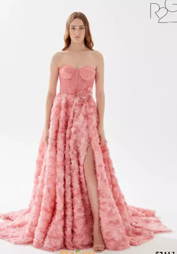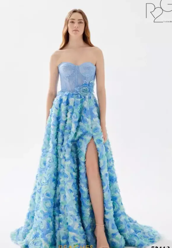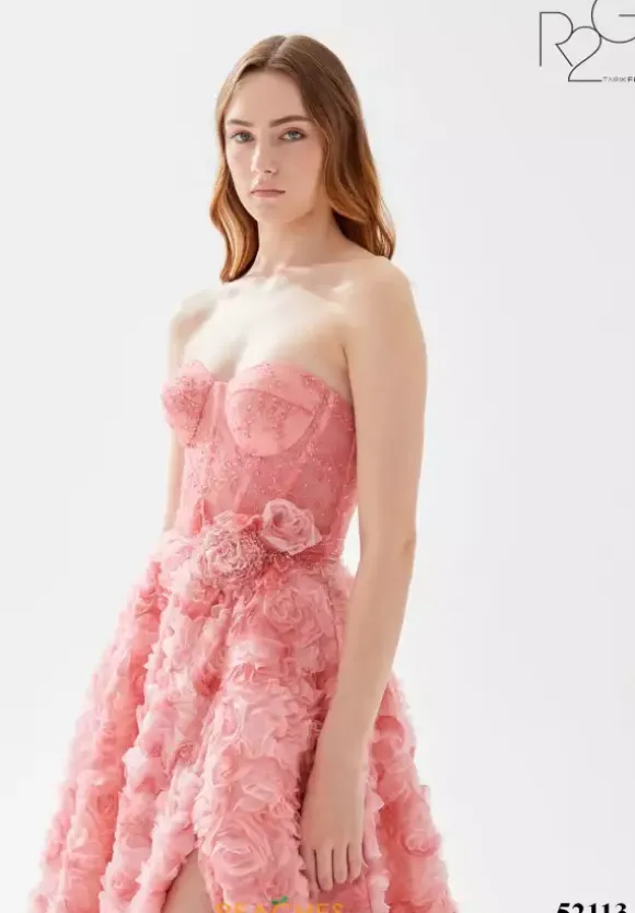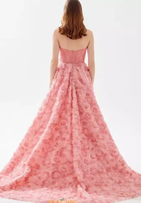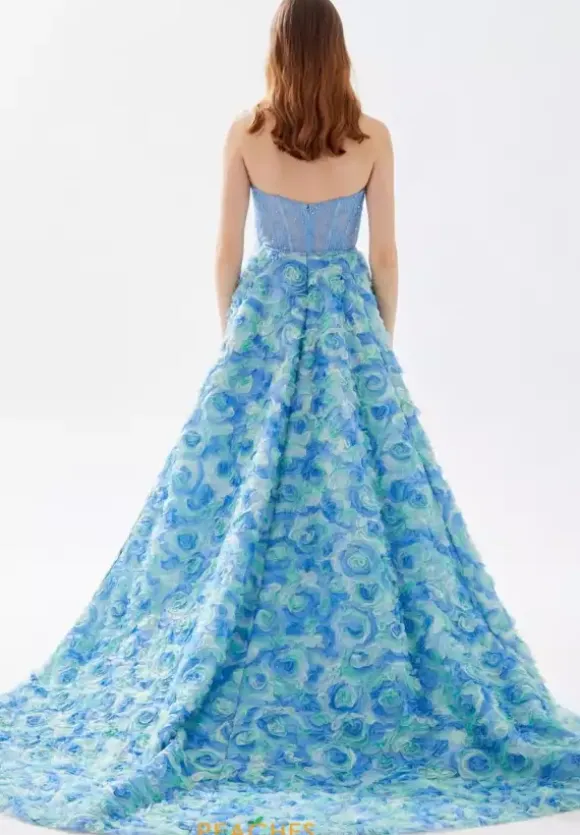 Step out your comfort zone when wearing this uncommon long dress by Tarik Ediz, style 52113. This fabulous number showcases a strapless sweet heart neckline on a corset bodice. THe bodice of this number is made out of a see through lace material with the illusion of exposed boning. The skirt of this number is fully adorned with tulle shaped as flowers.