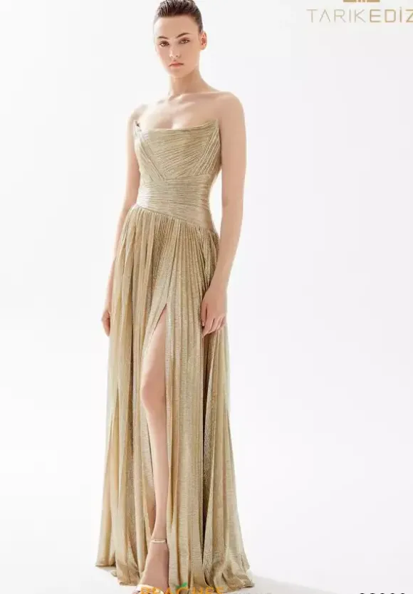 All eyes will be on you when you enter your special event in this fabulous Tarik Ediz dress 98200. Made from a novelty jersey metallic material this scoop style neckline has a structured bodice in a ruche crisscross pattern. The pleated a line skirt has a front slit which makes it easy to dance the night away in.