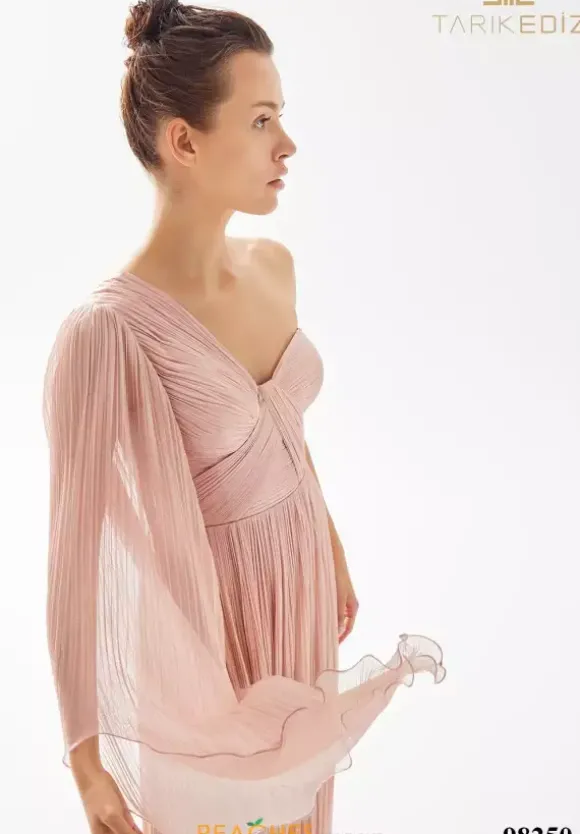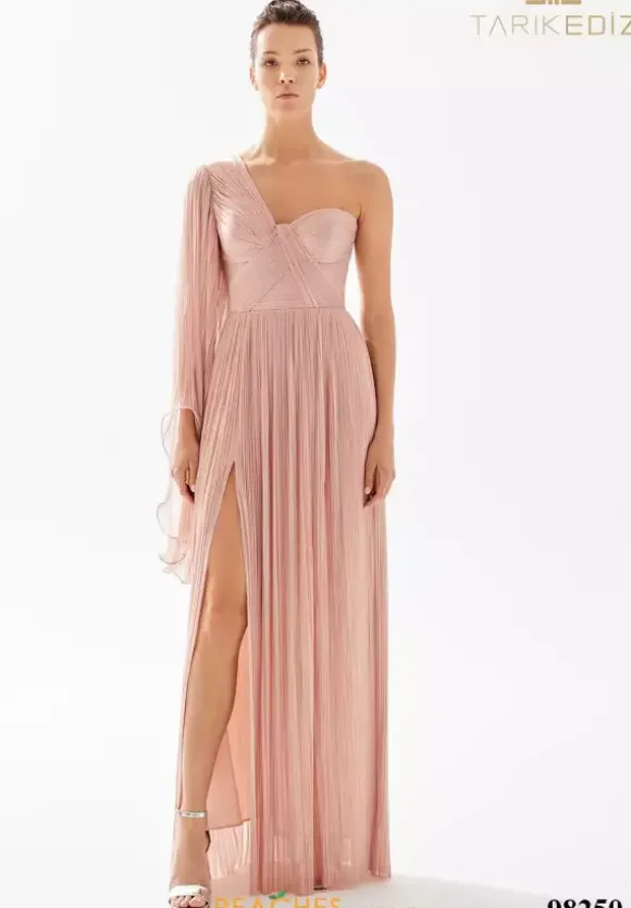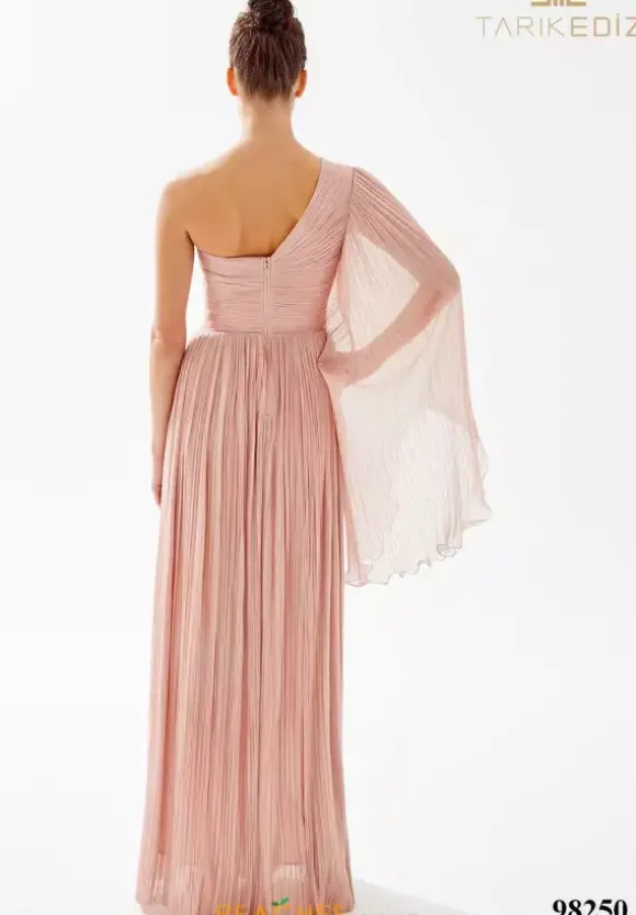 Exude grace at your next event in Tarik Ediz style 98250. Made of lovely tulle material, this gown features a single shoulder neckline defined by a loose single sleeve that drapes beautifully. The fitted bodice displays an elegant center detail and an incredibly flowing skirt that hides the side slit.