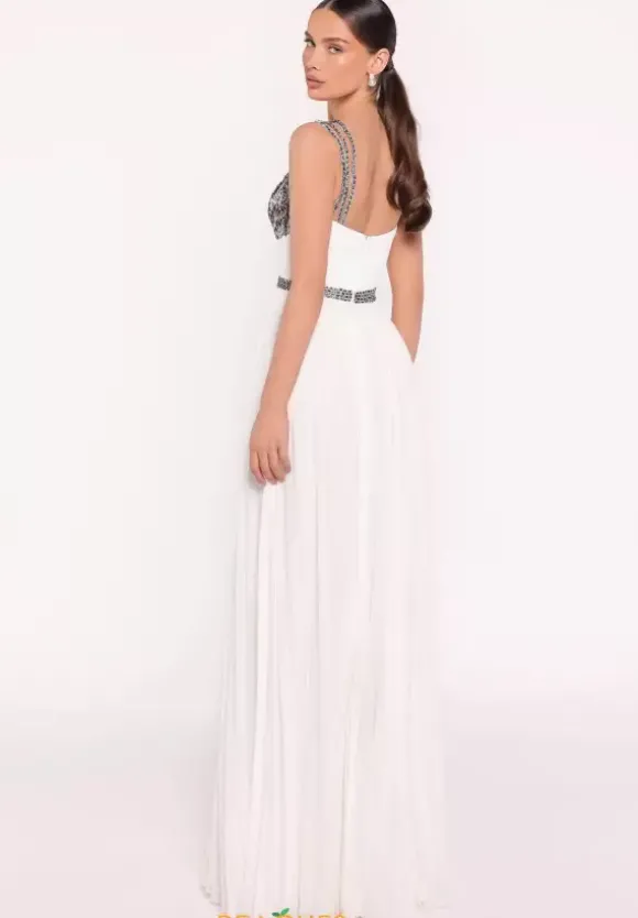 Feel like a goddess when wearing this long s- line dress by Tarik Ediz, style 98717. Showcasing a single asymmetrical strap thats’s adorned with glistening swirling designs and patterns. Featuring a stunning bodice that will hug your bodice gorgeously all night long, embellished with a bedazzled belt. The bottom is made out of chiffon material which will add a flowy effect. For the perfect final touch it has a sexy thigh high slit. You will for sure going to look spectacular at your next special event.