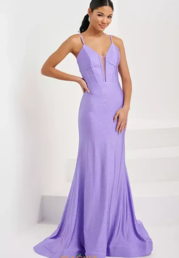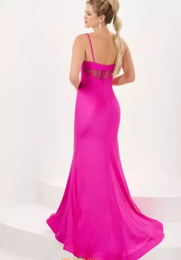 Make everyone stop and stare with this ravishing Tiffany dress 16062. Sleek and simple dress reveals a plunging v neckline with thin straps. Made out of stretch glitter material, this lavish gown will ensure you comfort and elegance at the same time. Corset bodice and sweep train are perfect for any special occasion.