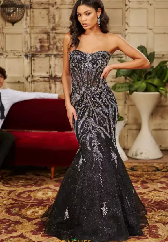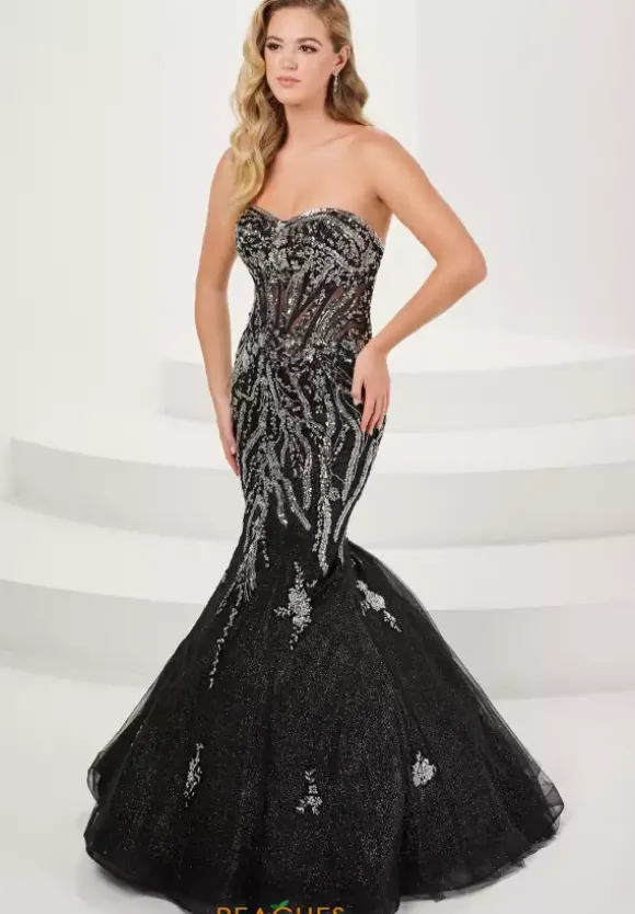 Bring out your inner fashionista when you wear this show stopping Tiffany dress 16074. Showcasing a strapless sweetheart neckline, this lavish mermaid dress is accompanied by a see through corset bodice. Garnished with shimmering beadwork and sparkly tulle material, this gorgeous dress will ensure you to be seen from miles away.