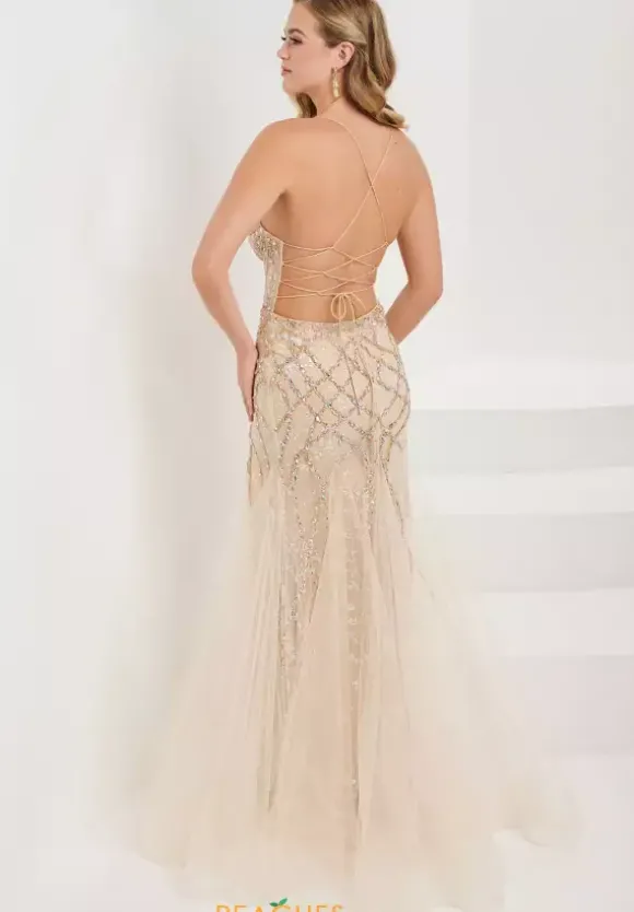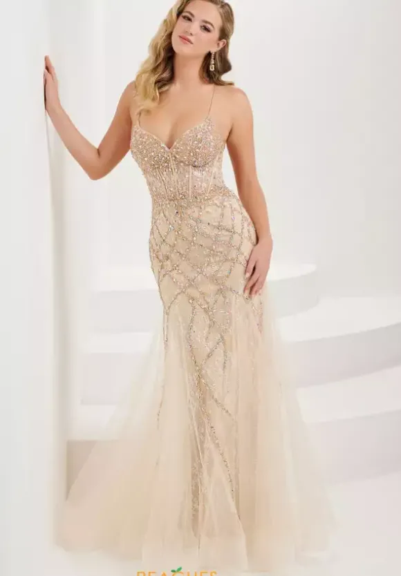 Awe the crowd in this impeccable mermaid Tiffany dress 16105 an ideal choice for your senor prom. This ultra glam gown features a low v neckline with dainty thin straps. All eyes will be on you in this flattering corset bodice and lace up closure that accentuates your hourglass figure. Radiant beads and lustrous stones illustrate an elaborate embellishment cascades beautifully onto the entire ensemble.