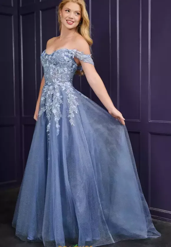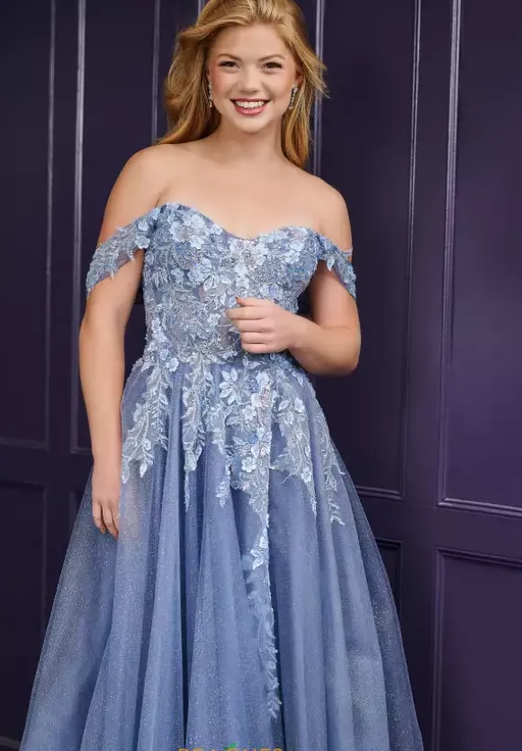 The perfect choice for your upcoming prom is this beautiful A line dress style 16243 by Tiffany. Featuring the straight across neckline paired with detachable swag sleeves. Showcasing the fitted corset lace bodice is adorned meticulously with delicate applique cascading down the small of the waist and sparsely down the full tulle skirt.