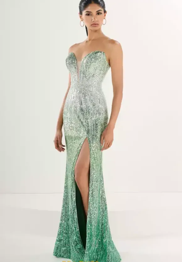 Steal the spotlight in this stunning dress by Tiffany, style 16257. This jaw dropping gown features a strapless deep V neckline that’s sure to turn heads. The structured bodice perfectly hugs your silhouette and is fully embellished with intricate beadwork that flows seamlessly into the fitted skirt. For a final touch of allure, the skirt features a bold thigh high slit.