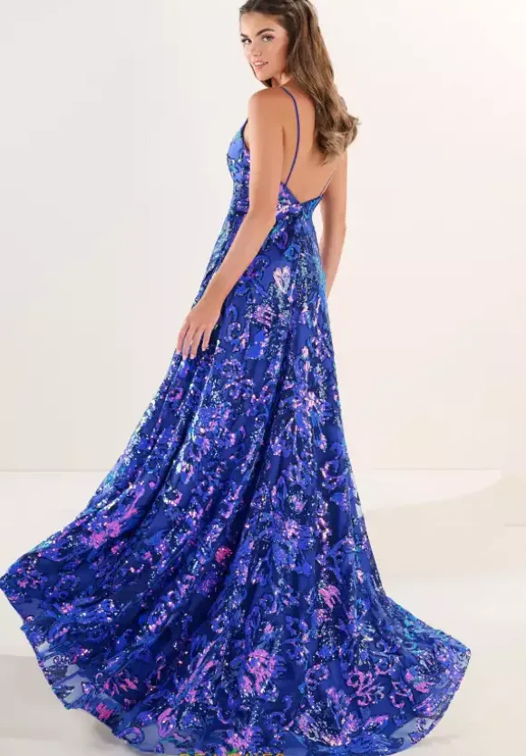 Show off your unique side when wearing this incredible Tiffany dress, style 16244. This one of a kind dress features a stunning pattern with dazzling sequins that will attract the attention of everyone around you. The beautiful V neckline is paired with supportive straps. This A line skirt features a captivating slit along with a gorgeous train.