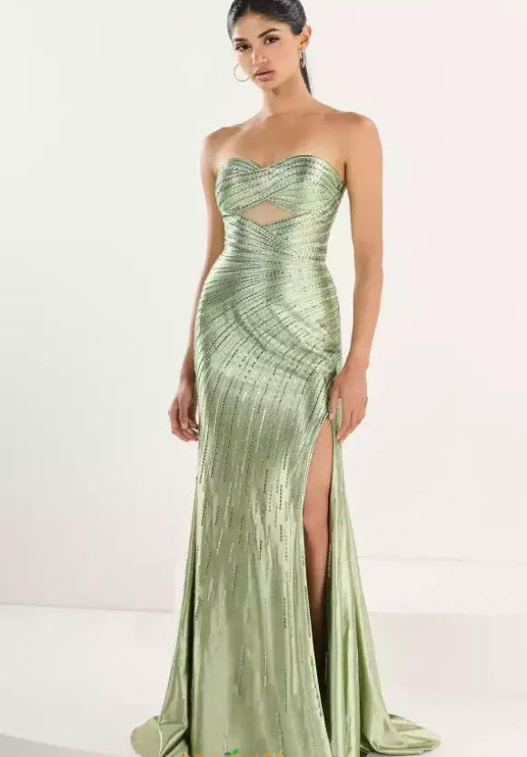 Make a dramatic entrance when wearing this long fitted jersey dress by Tiffany, style 16278. This extravagant dress features a flattering strapless sweetheart neckline with a key hole cut out cascading into an open back. Made in striking beadwork from head to toe, you will for sure shine from every angle. The slit and long sweep train completes this look.