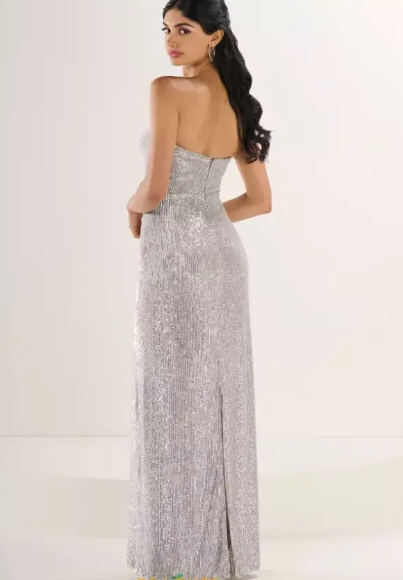 Exude elegance in this ultra sleek Tiffany fitted dress 6305. Showcasing a strapless neckline, the fitted bodice highlights a lovely floral detailing that adds a romantic touch. Shimmering sequins adorns the entire ensemble that will have you gleaming all night long. An edgy back slit gives this style a dramatic factor perfect for a grand exit.