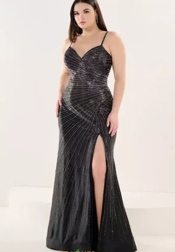 Exude confidence in this stunning Tiffany plus size dress 16307. Sexy, yet sophisticated this gorgeous style features modest v neckline and dainty beaded straps. Bright stones create an elaborate array of embellishment that is the epitome of perfection. Made in a fitted jersey fabric, the log fitted skirt showcases a dramatic high slit.
