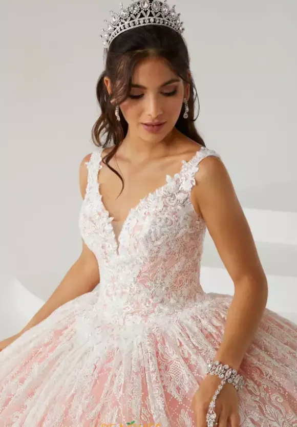 We are loving the versatility of this elegant ball gown dress 26005 by Tiffany Quinceanera. This dress showcases a v neck bodice with applique and lace detail and detachable lace long sleeves. The beadwork is very elegant and memorable along with the skirt and the train of this dress. The back of the bodice features a classic corset lace back.