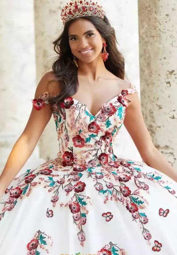 All eyes will be on you when you enter the room in this jaw dropping Tiffany quinceanera dress 26039. The hand sewn details of flowers and butterflies adorn the sweetheart neckline bodice. Cap sleeves fall effortlessly off the the shoulders and comes with a coordinating cape. The tulle skirt hem line is bordered in matching detail all the way around.