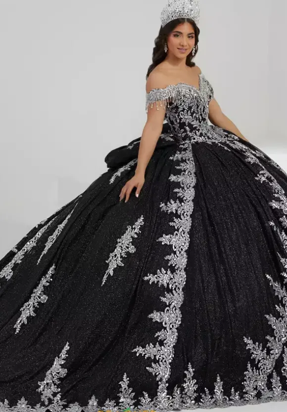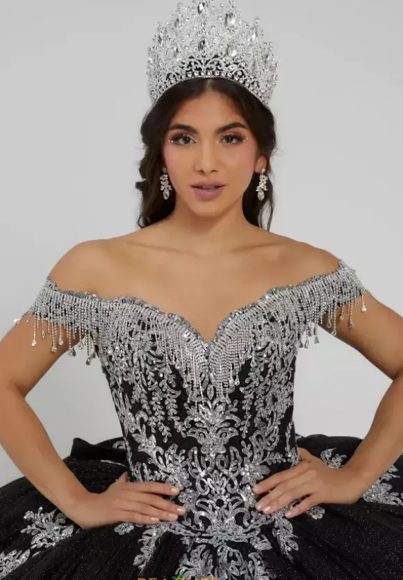 Look like royalty in glistening ball gown 26060 by Tiffany Quinceanera. Contrasting sequin and fringe beadwork details are featured throughout the entire dress giving you eye catching detail and sparkle as you flaunt the classic sweep train and traditional corset bodice along with the voluminous glittering tulle skirt. This dress is completed with an oversized bow.