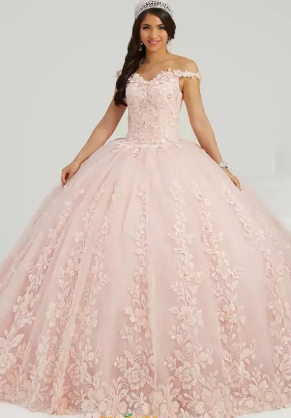 Dance the night away in exquisite ball gown 56484 by Tiffany Quinceanera. This dress is the perfect pick and showcases a trendy off the shoulder neckline accompanied by off the shoulder cap sleeves along with a classic voluminous tulle skirt and sweep train. Cinch and adjust the fitted bodice with the traditional crisscross lace up closure. Shimmering combinations of appliques and beadwork are featured on the bodice, hem, and sweep train.
