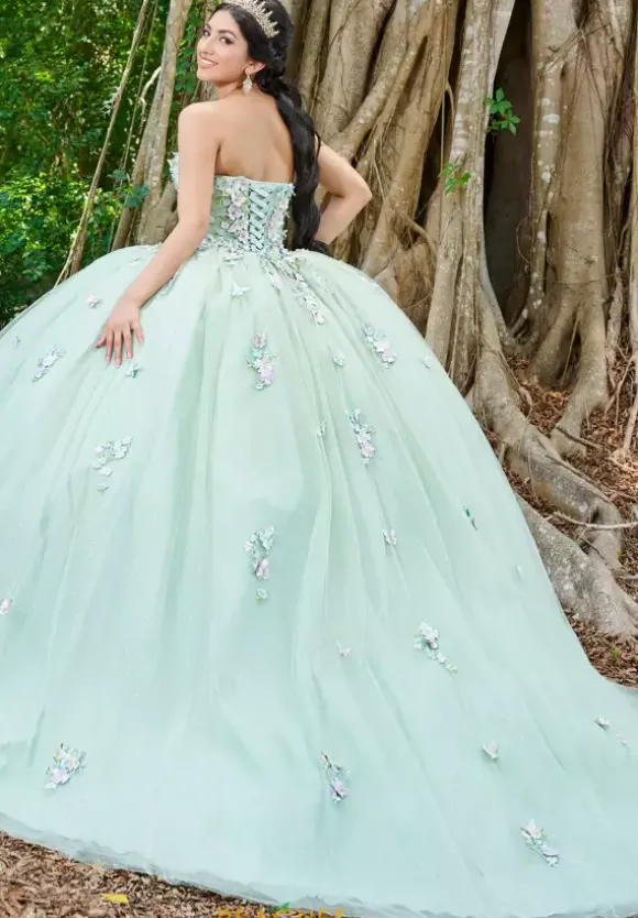 Live a real life fairy tale and look like a modern day princess at your quinceanera in this long ball gown style 56500 from Tiffany Quinceanera made in beautiful soft tulle colors. This ethereal gown showcases a strapless corset bodice adorned with multi colored 3D floral appliques and beads with a lace up tie back. The full ball gown skirt has layers of glitter tulle with a sweep train. Detachable princess sleeves can be worn on or off the shoulder with draping floats.