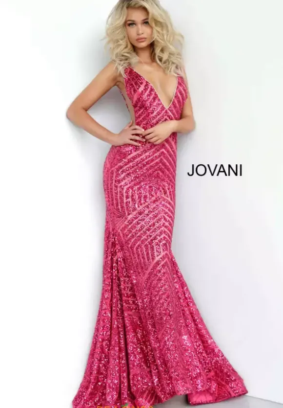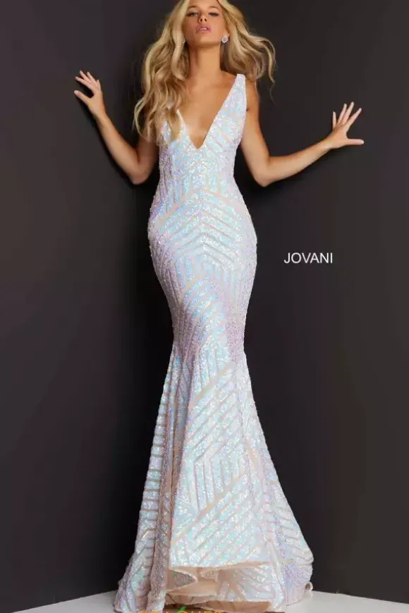 Sleek yet sexy is the way to go in this ultra glamorous Jovani dress style 59762. This fitted ensemble showcases a plunging V-cut neckline that gives you the ultimate touch of sexy. A geometric like beading pattern is featured throughout, as a long dramatic train cascades behind you. For more Jovani designs, check out Peaches Boutique in Chicago.