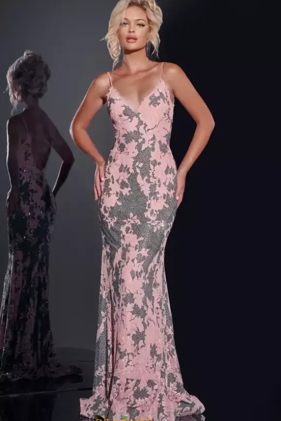 Show up in this one of a kind Jovani long fitted dress style 44033. The v neckline dress has a sparkling fully sequins under layer with gorgeous floral inspired pink lace appliques that adorn over the sequins. Available only in this silver and blush combination, this fitted long dress is a must have choice.