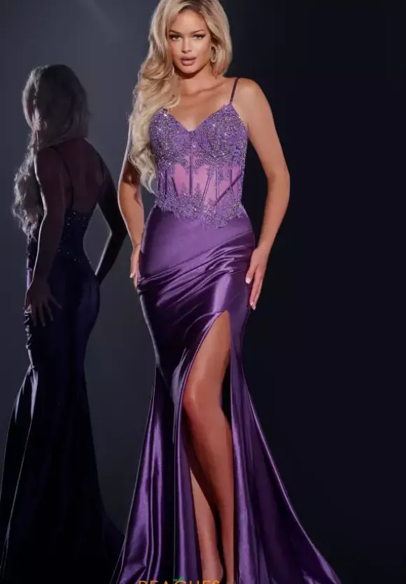 Sleek and elegant makes this Jovani long dress a must have choice for prom. The all over stretch satin dress style 42259 has a v neckline and a shear illusion waistline. Beaded appliques adorn the bust of the bodice and along the waistline of the fitted satin skirt. The long skirt has a long sweeping train and front side slit.