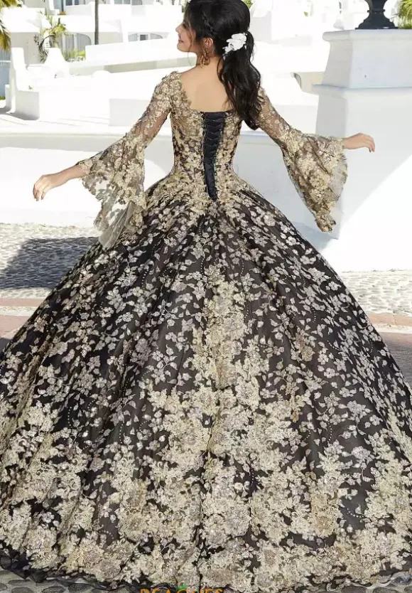 Show stopping ball gown dress 34075 by Valentina is the perfect choice for your special day. This extravagant dress showcases a v neckline with glamorous long bell sleeves. The all over glitter appliques deck the bodice and the full ball gown skirt making it shimmer and glisten at all angles. Included is a matching stole.