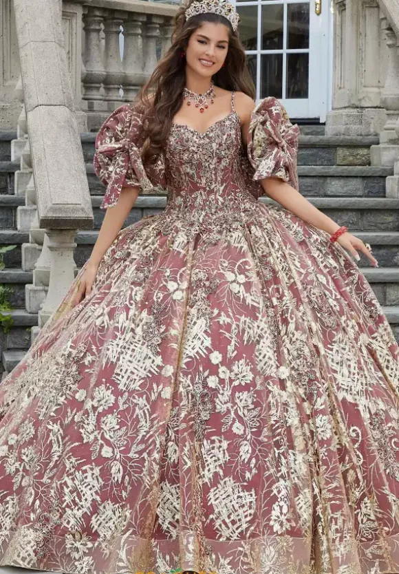 Mesmerizing ball gown dress 34085 by Vizcaya grants you options. Featuring a detachable back bow along with rosette sleeves, this dress is a must have. Striking lace and appliques adorn this dress giving you the ideal amount of sparkle and detail while ruffled layers of fabric transition into a classic sweep train.
